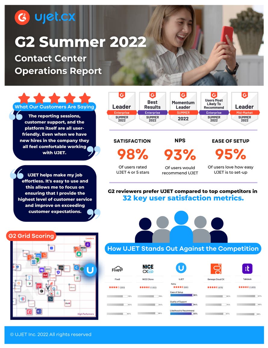 UJET has been named the leader in G2’s 2022 Summer Grid Report for Enterprise and Mid-Market Satisfaction in Contact Center Operations Software with a score of 98 out of 100, and it's all thanks to amazing customer support professionals like you.