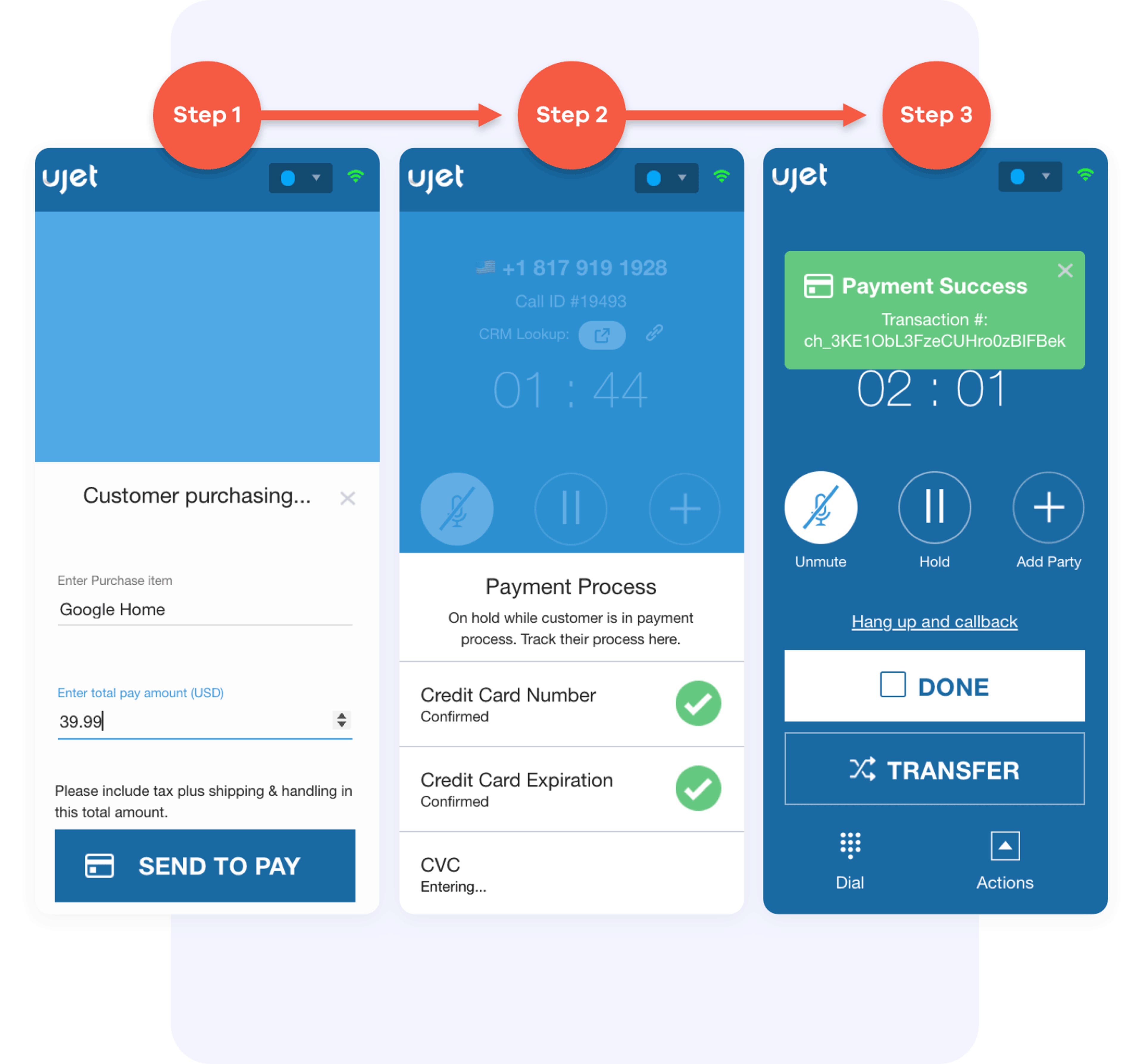 Securely process payments during mobile customer service interactions with PCI-compliant mobile payments. Instead of asking customers to read their card out loud, send a payment request to the customer's smartphone with SmartActions. The card information will be captured discreetly and processed securely and the customer and agent will simply receive a notification that the payment was successful.