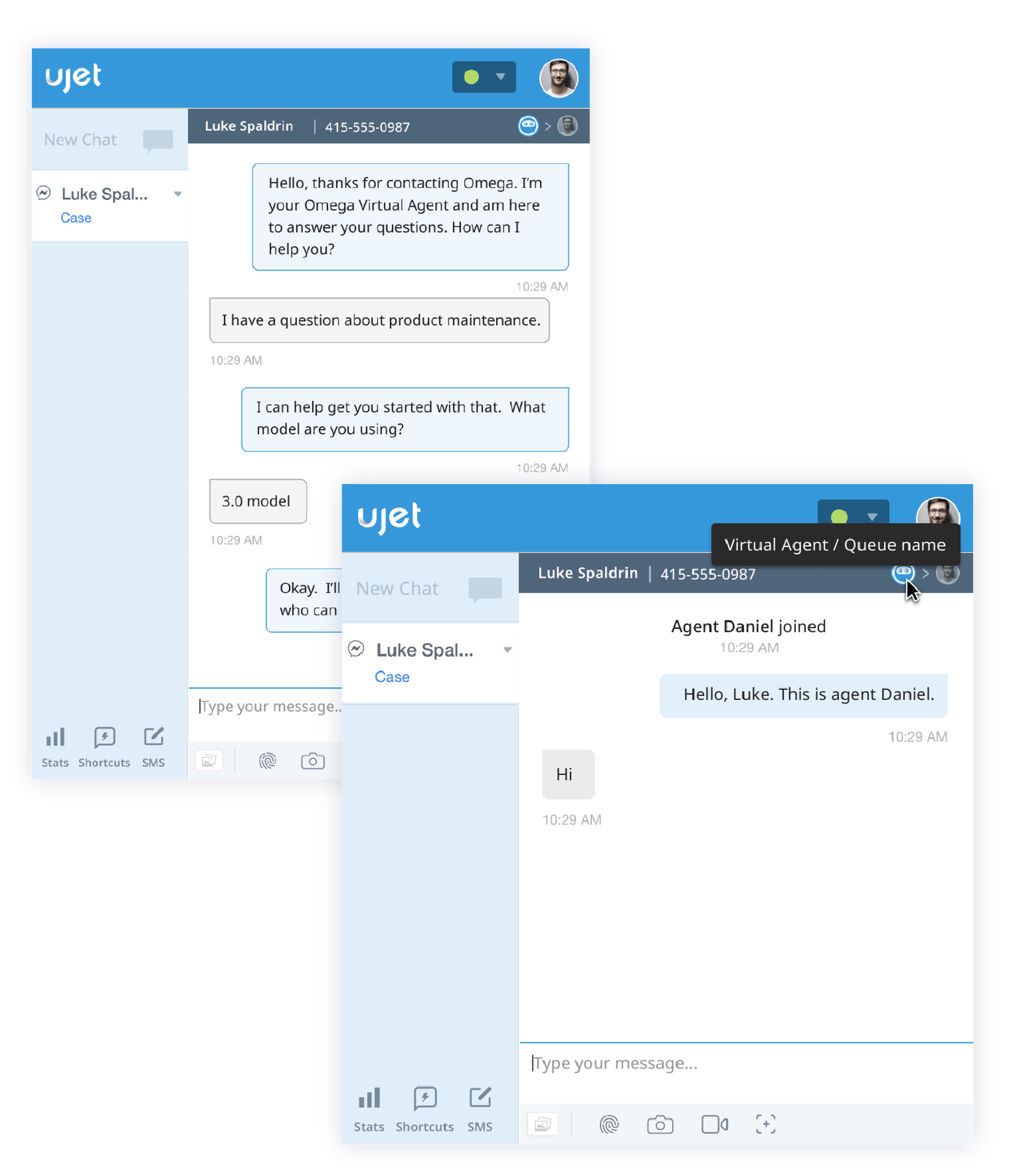 Not only is it important for a Virtual Agent to know when to bring in a human agent, but when they do, it’s critical that the customer journey be seamless. When handing off to a human agent, UJET’s Virtual Agent will provide both a transcript of the conversation along with key customer attributes so the agent has the insights and context needed to seamlessly continue where the Virtual Agent left off.